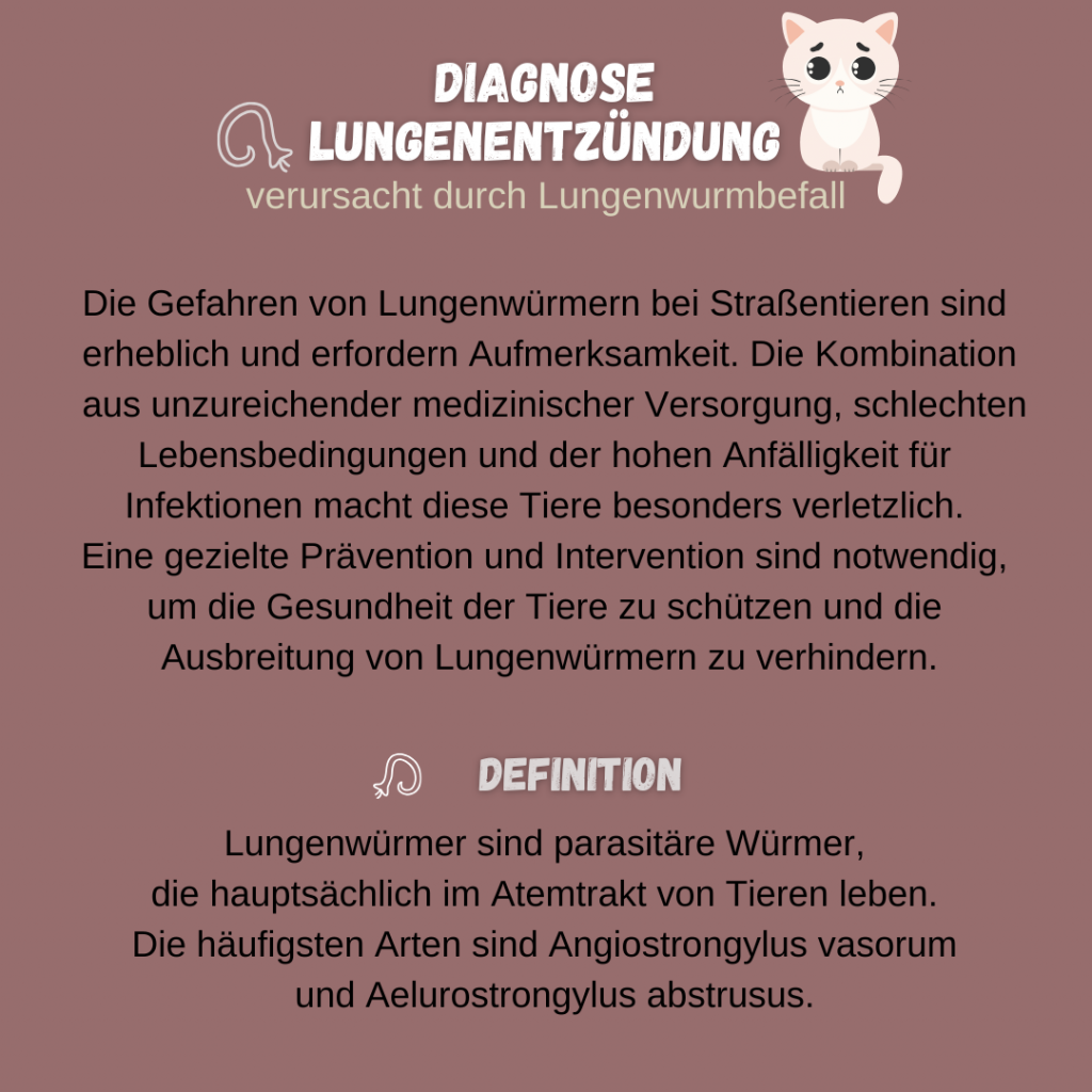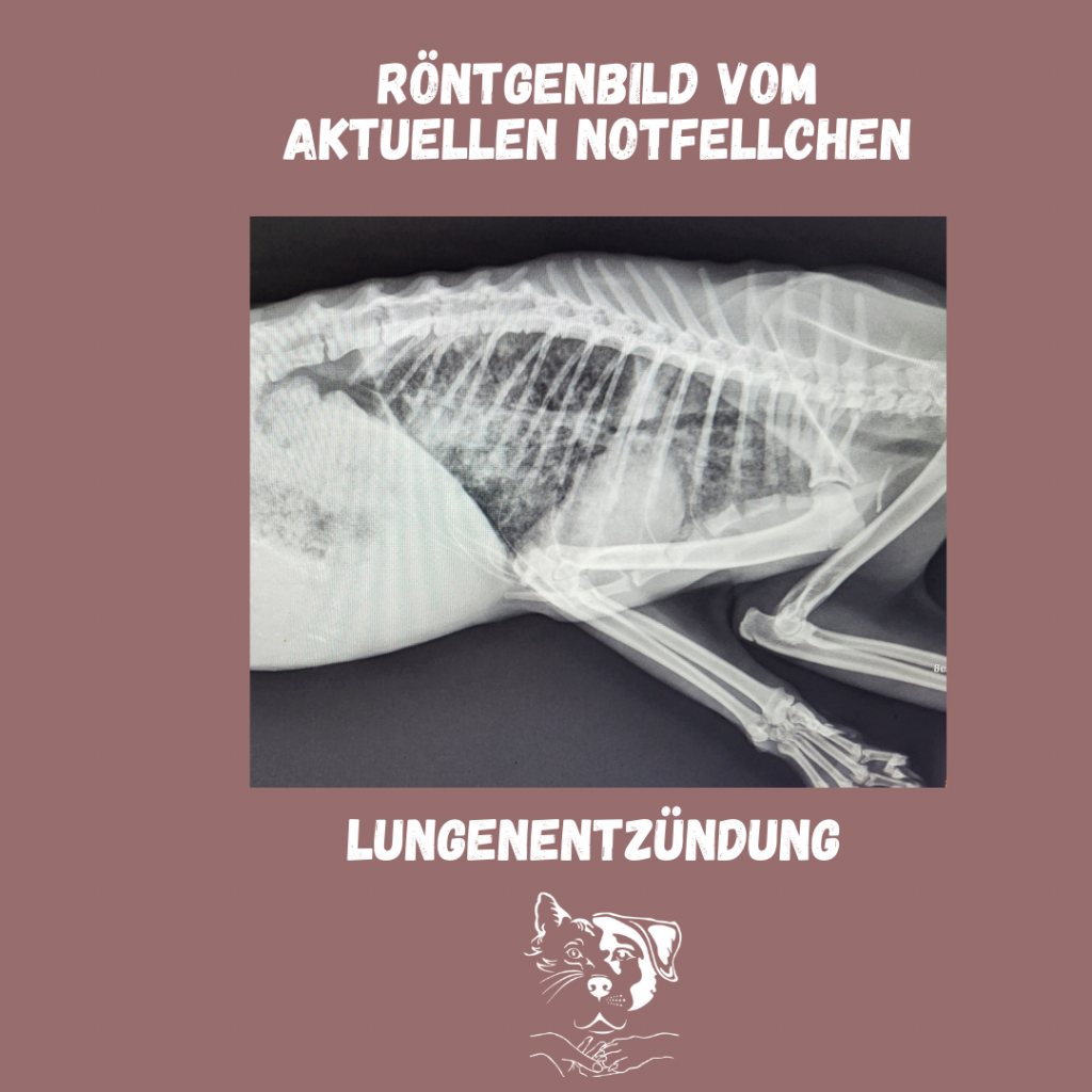 Wir hatten einfach kein gutes Gefühl dabei, ihn unter solchen Umständen wieder auf die Straße zu setzen, da dort viele Gefahren lauern und jede Schwäche schnell tödlich sein kann. Zunächst bekam der kleine Kater Medikamente, doch leider besserte sich die Atmung nicht. Daraufhin ließen wir ein Röntgenbild anfertigen, das eine Lungenentzündung offenbarte.